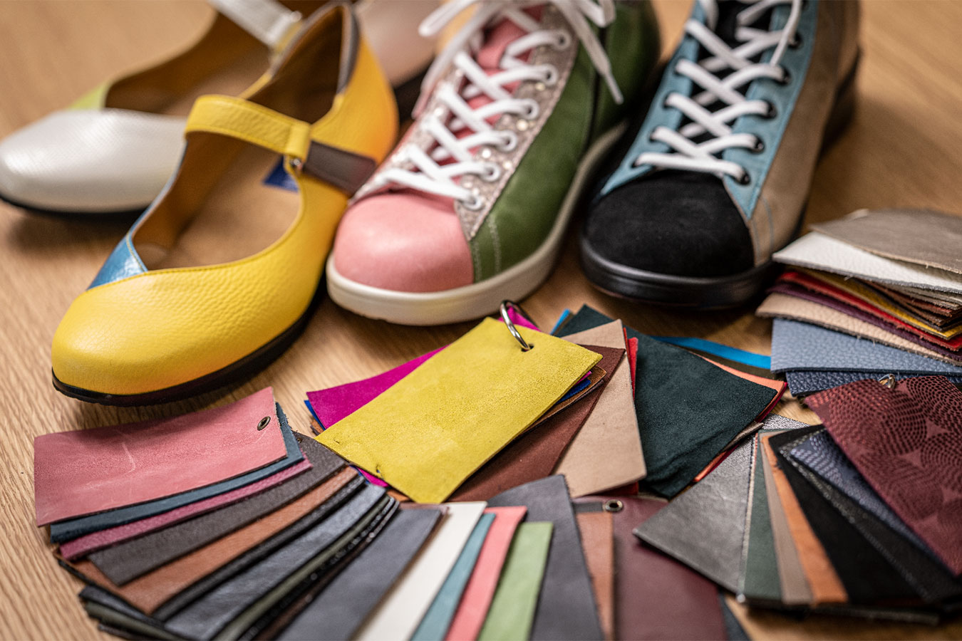 約100種類の革サンプルの中からハイカットスニーカーは最大8パーツ、パンプスは最大4パーツ色の配色を考えながらデザインをしていきます。 配色の知識がなくても、センスに自信がなくても大丈夫です。私たちシューズスタイリストと一緒にワクワクしながら、あなたを輝かせる世界で一つの靴を作っていきましょう。 出来上がった靴は不思議とその人の個性とマッチした靴が出来上がります。